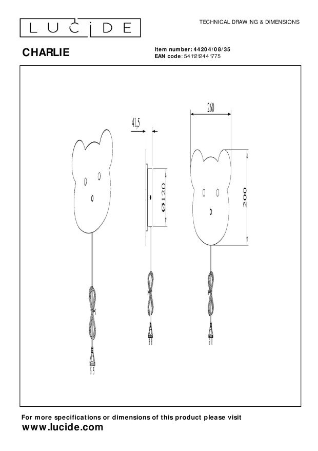 Spécifications Lucide CHARLIE - Applique Chambre d'enfant - LED Dim pour réchauffer - 1x7W 2600K/2700K - Bleu :