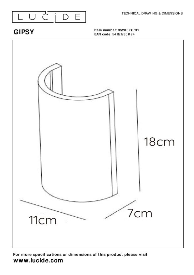 Spécifications Lucide GIPSY - Applique - 1xG9 - Blanc :