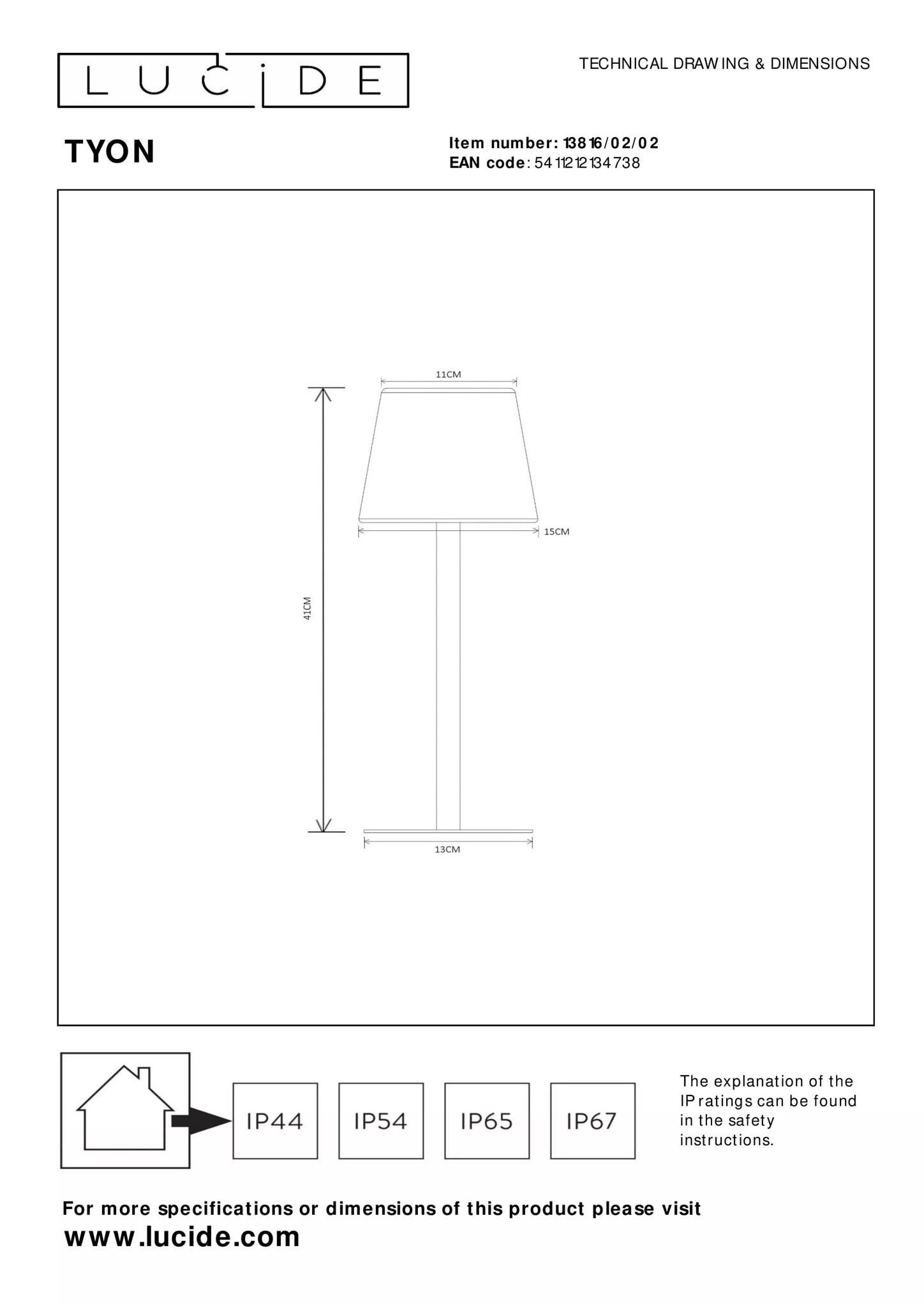 Caractéristiques Lucide TYON - Lampe de Table Rechargeable Intérieur/Extérieur - Accu/Batterie - Ø 15 cm - LED Dim. - IP65 - Or Mat / Laiton :