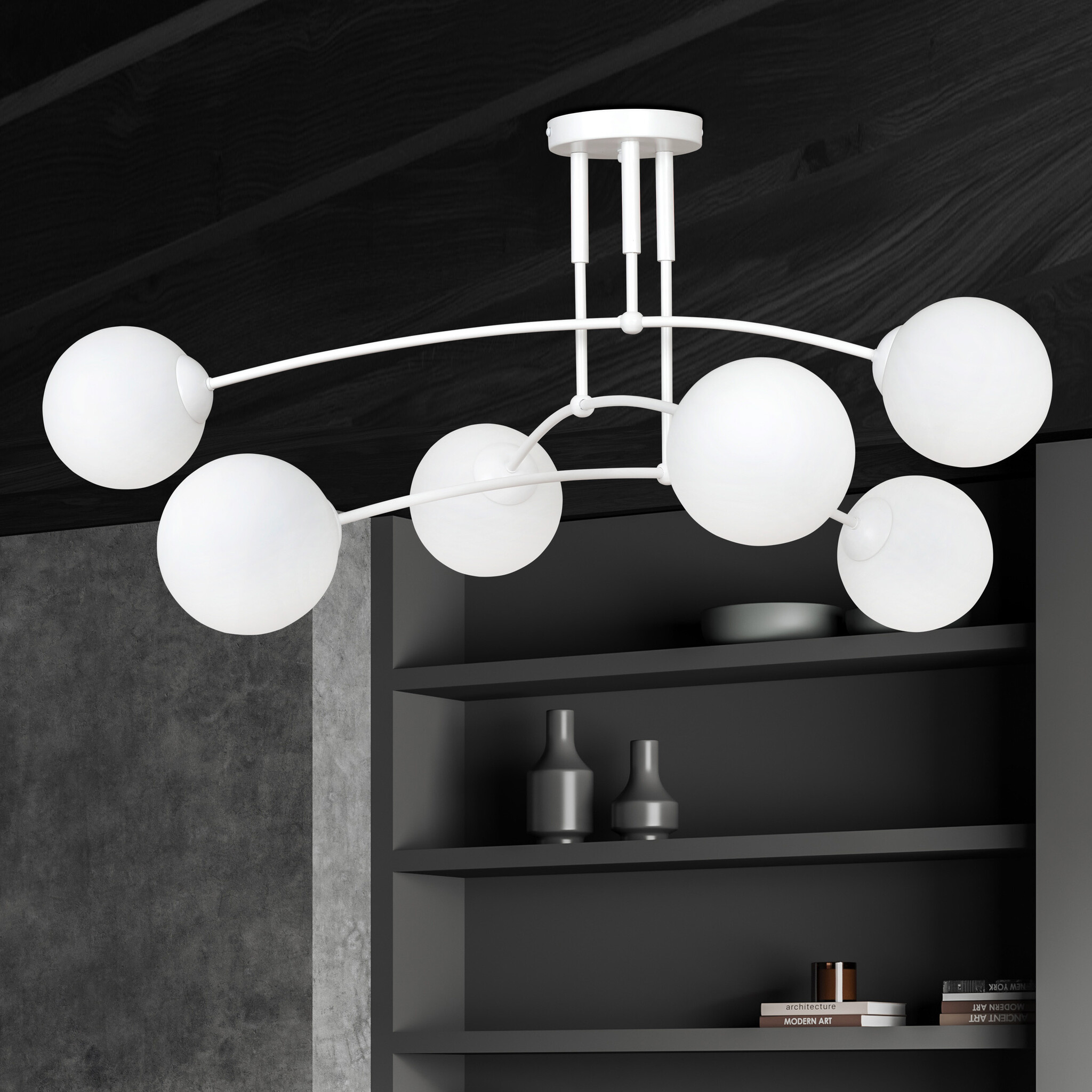 Plafonnier Lahti blanc triple courbé avec 6 ampoules E14 en verre blanc