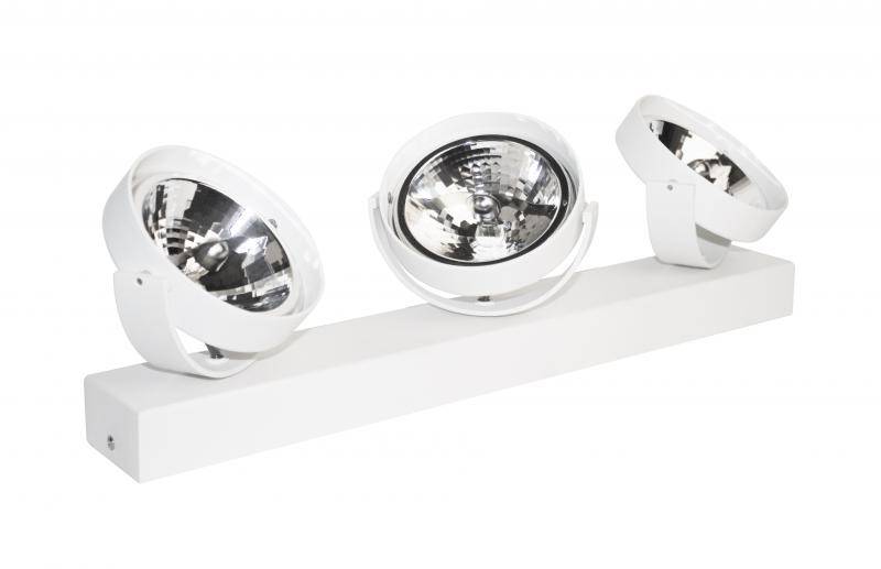 Ce plafonnier orientable blanc, noir ou argent 470mm large a 3 culots de lampe pour 3 lampes AR1111. Les 3 culots de lampe G53 sont aptes pour des lampes LED AR111. Si vous optez pour des lampes LED, il est conseillé de remplacer le transformateur puisque celui-ci fonctionne sur 11,5V et les lampes LED sur 12V. Si vous ne le remplacez pas, il se peut que vos lampes LED commencent à clignoter (après quelques mois) et que votre transformateur devient défectueux.