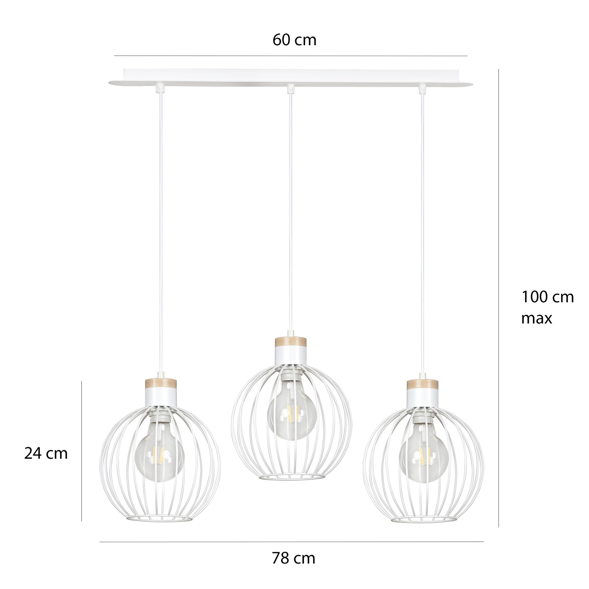 Spécifications Tornio 3L suspension longue blanche avec structure en bois clair métal 3x E27 :