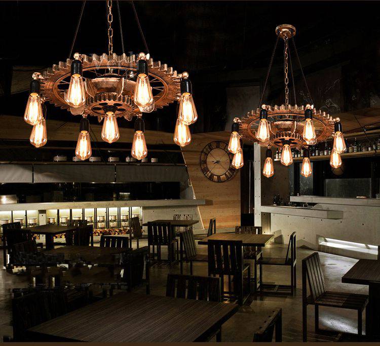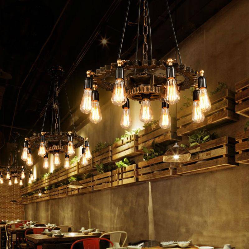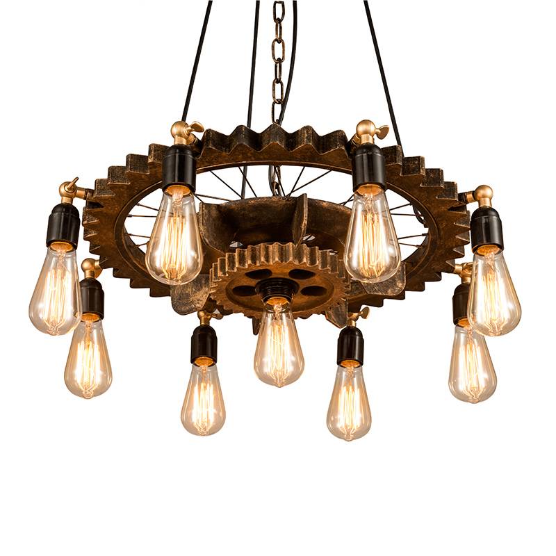 Il se compose de 2 engrenages en bois et est suspendu par une chaîne en acier et 3 câbles d'alimentation. Il y a au total 9 pieds de lampe sur les roues en bois, dans lesquels il est préférable de placer une longue lampe à filament LED. Consultez nos produits connexes.
