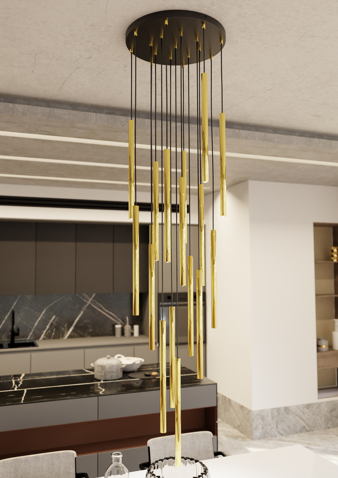Lampe à suspension cylindrique dorée Veneto 17 tubes pour LED G9