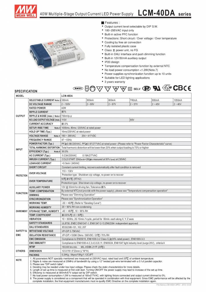 Specificaties Dali driver dimbaar Meanwell 42W IP20 :