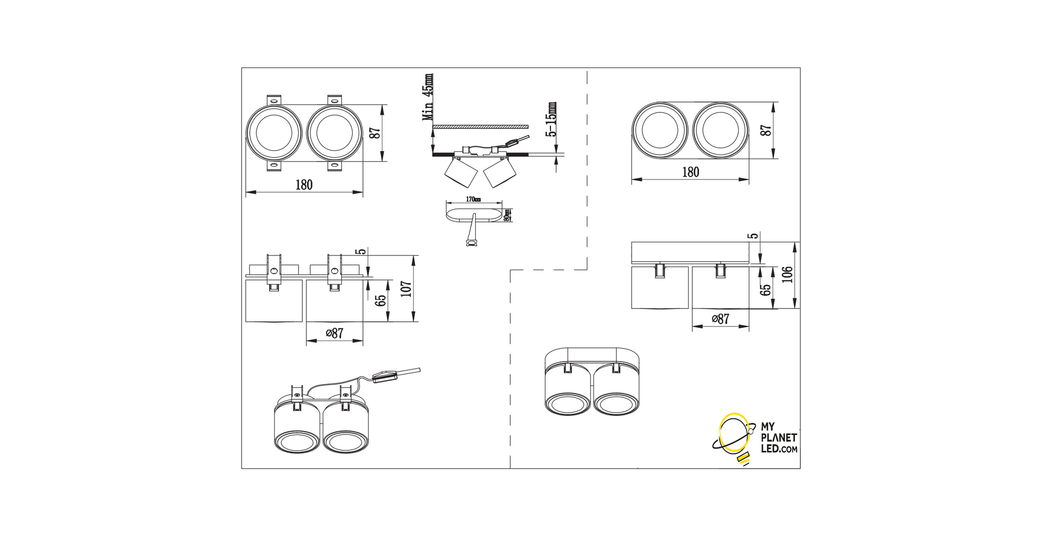 Specificaties duo inbouw of opbouw plafondspot 2x5W 3000K mat zwart: