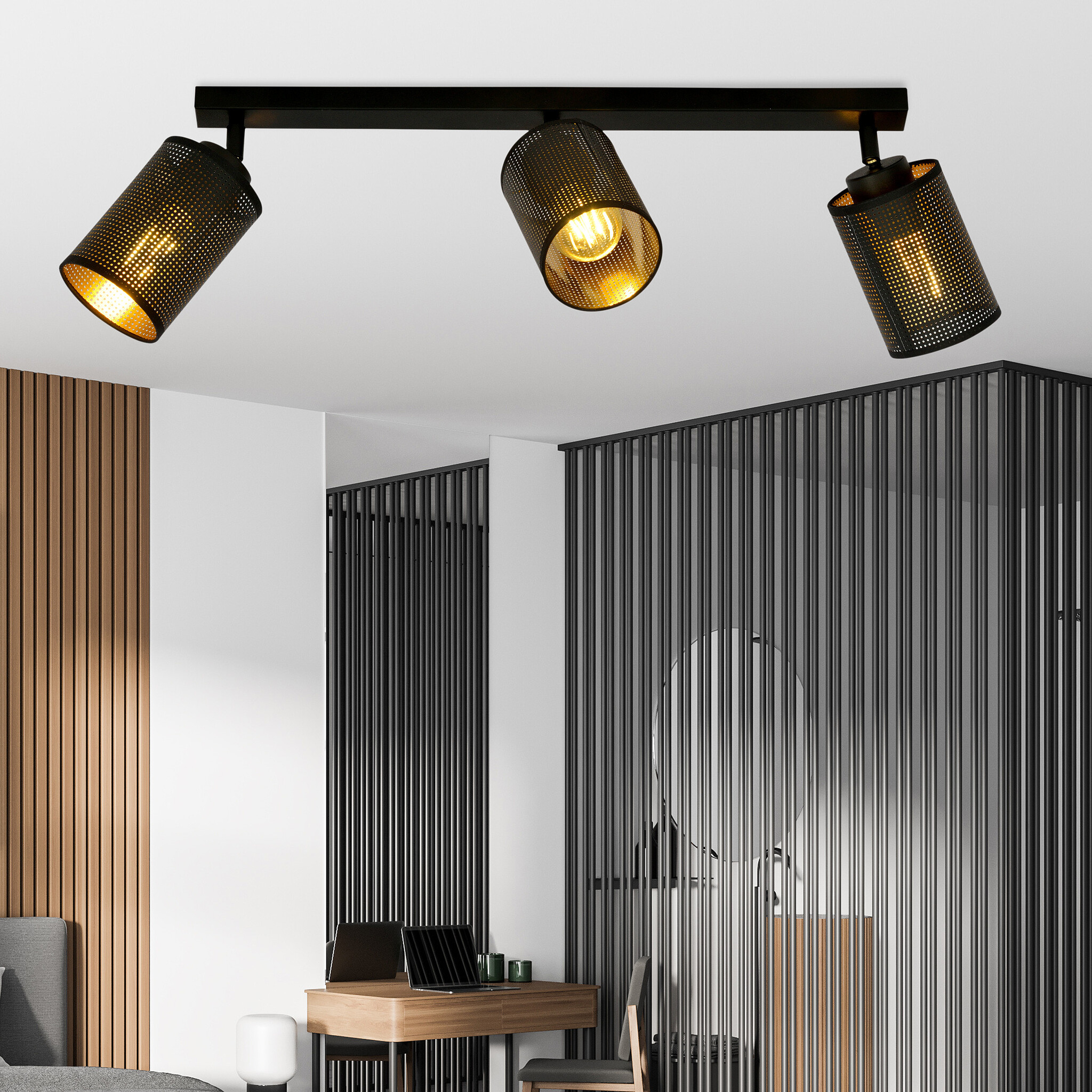 Fredericia triple lange zwarte plafondlamp met zwart en gouden kokers