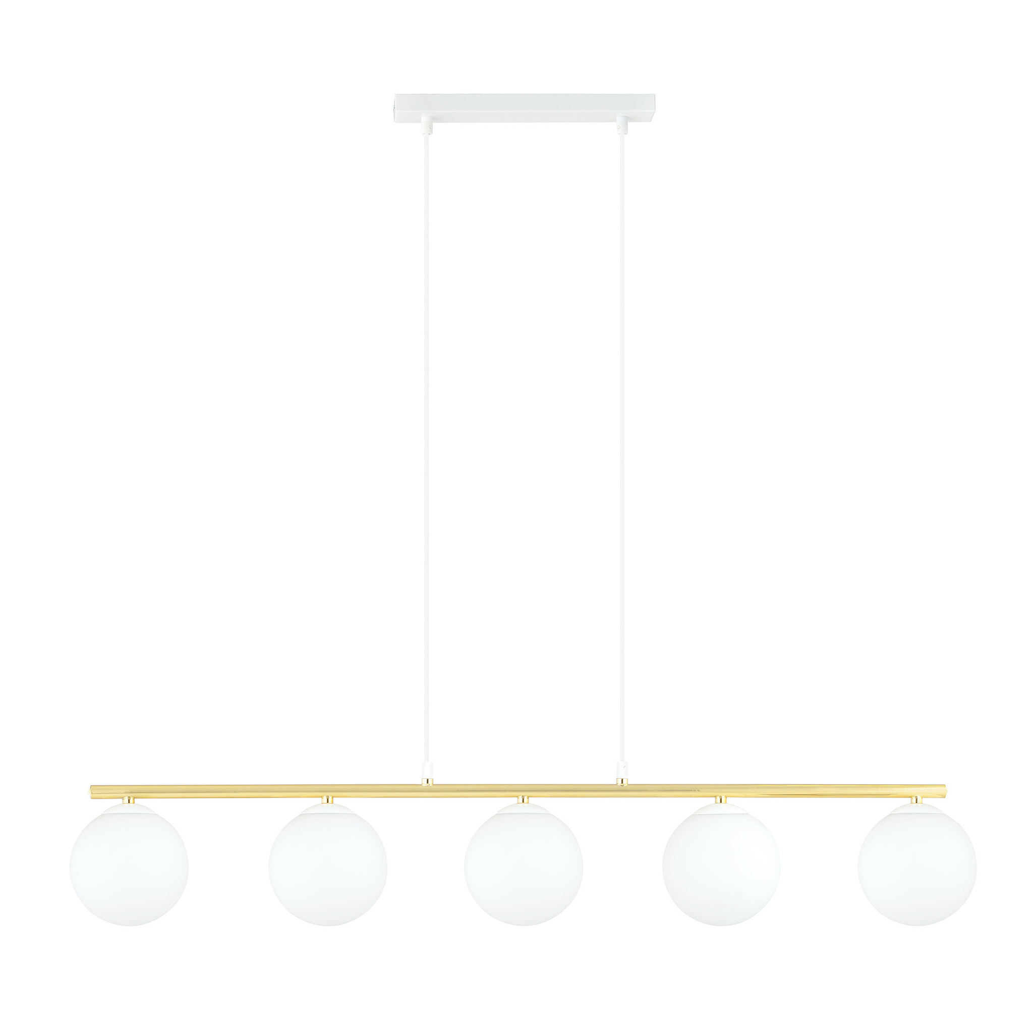 Hele lange witte en messing hanglamp 5x E14 melkglas bollen