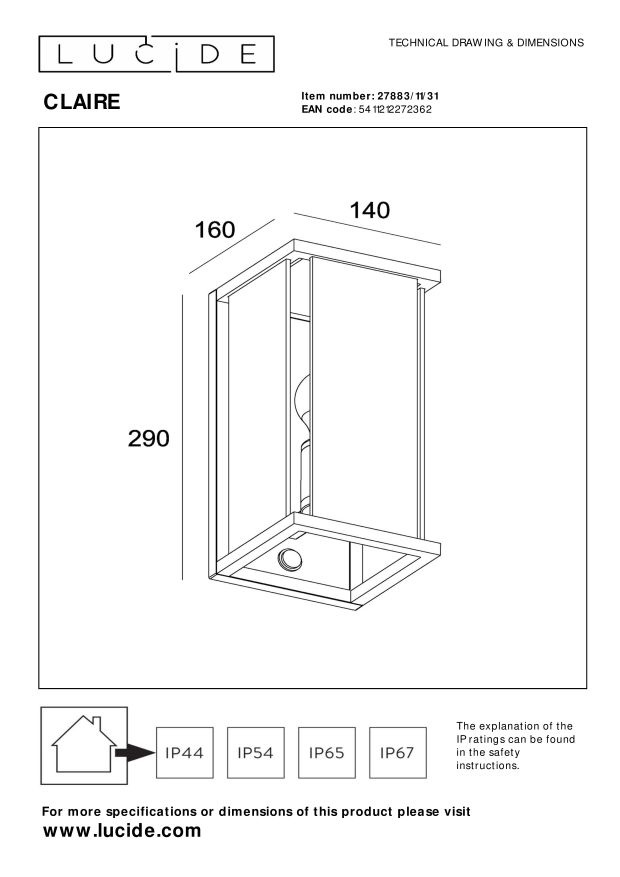 Specificaties Lucide CLAIRE - Wandlamp Binnen/Buiten - 1xE27 - IP54 - Beweging & dag/nacht sensor - Wit: