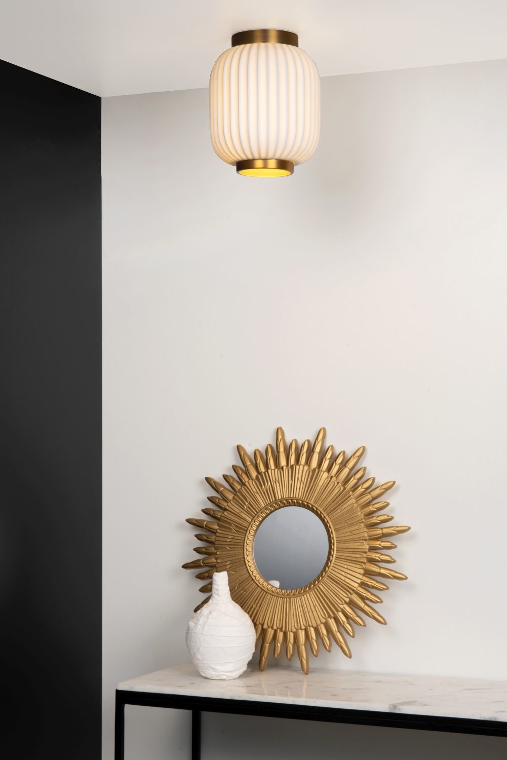 Als je op zoek bent naar witte plafond lampen, dan ben je bij Myplanetled.com goed terechtgekomen. Koop deze witte/messing geribbelde plafondlamp 19,5 cm E27 wit en we leveren deze snel en met de grootste zorg tot bij u. Ook voor meerdere stuks of professionele aankoop kan u bij ons terecht. Contacteer ons via chat, mail of telefoon en u zal overtuigd worden door onze vakkennis en service.