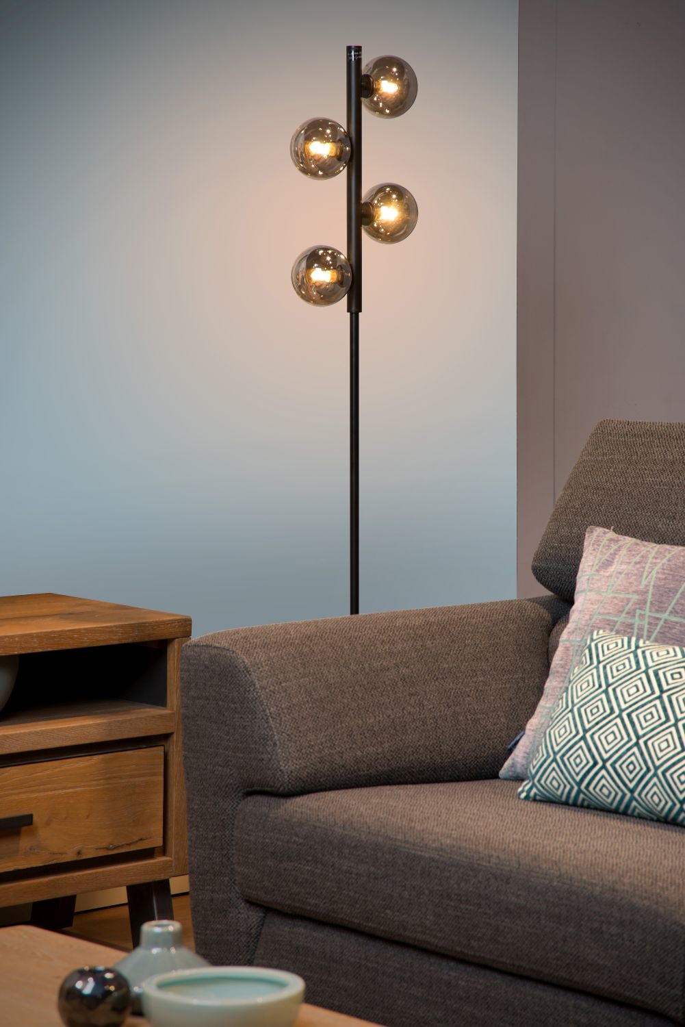 Zwarte vloerlamp met gefumeerde bolletjes 4xG9