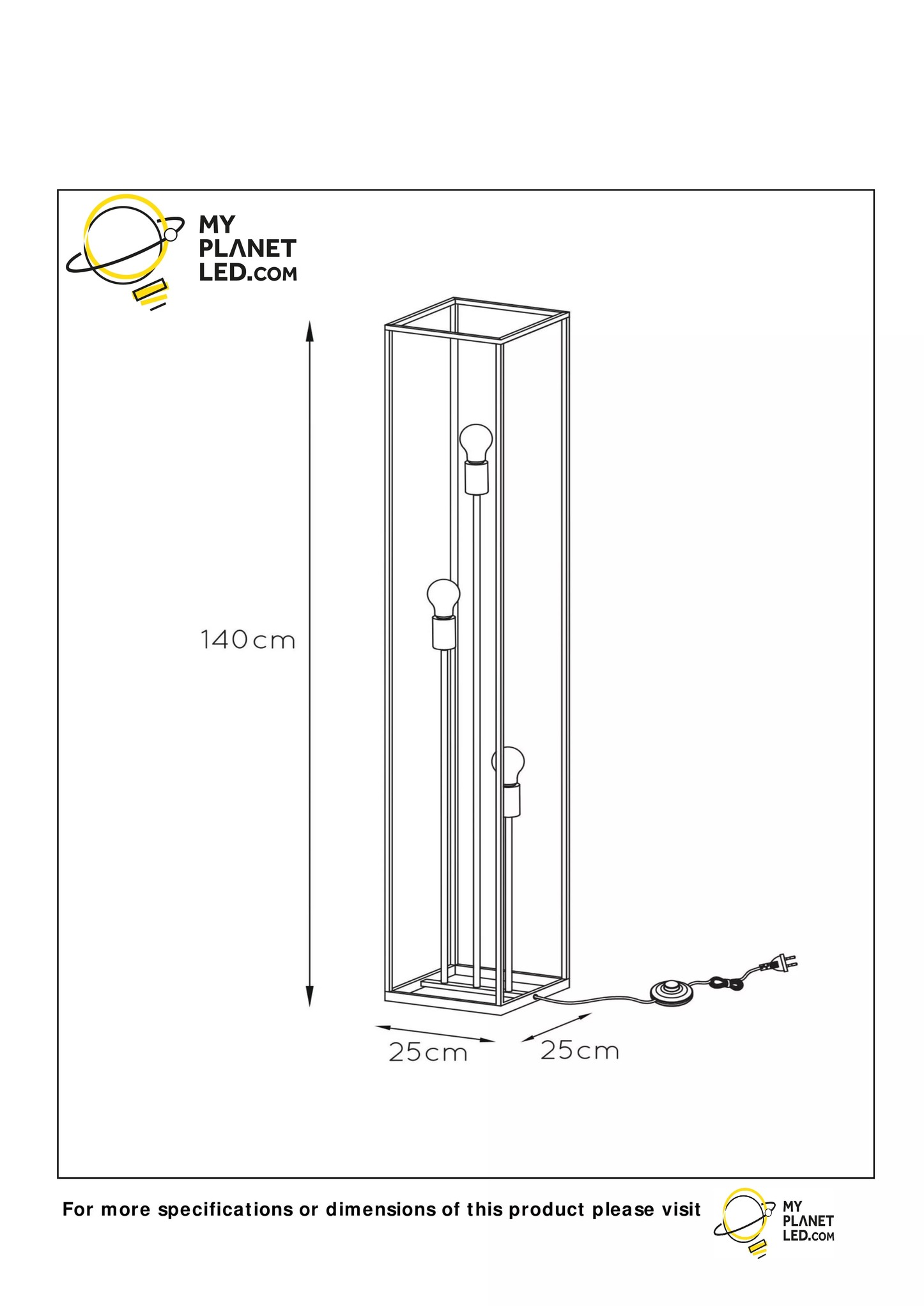 De hoogte van deze zwarte staande lamp is 140 cm, de breedte en lengte is 25 cm. Er is een snoer met stekker van 2 m voorzien met een switch.